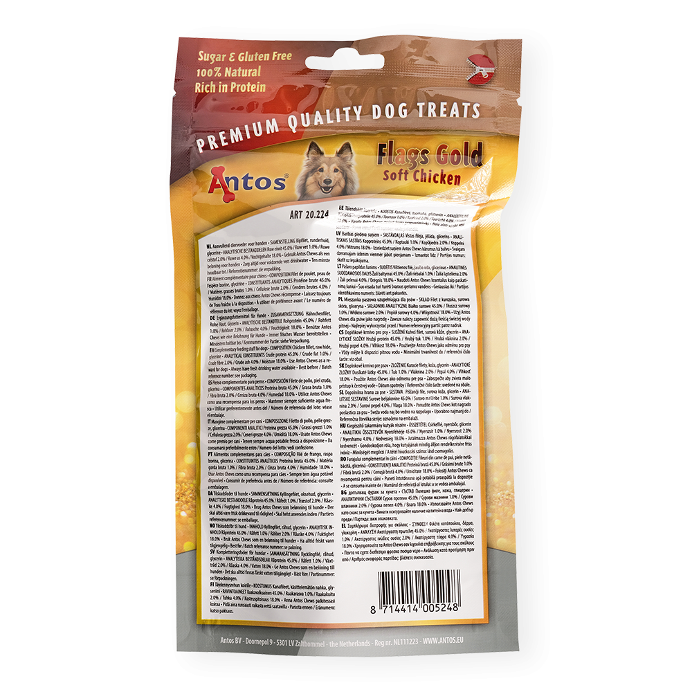 Muéstrale a tu perro quién ha sido un buen chico con nuestro Antos Flags Gold. Estas golosinas para perros están hechas con pechuga de pollo envuelta a mano alrededor de un palo de cuero crudo. Especialmente ideal para los perros que aman lo mejor de ambos mundos.