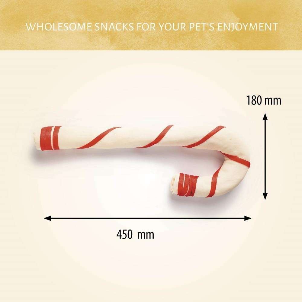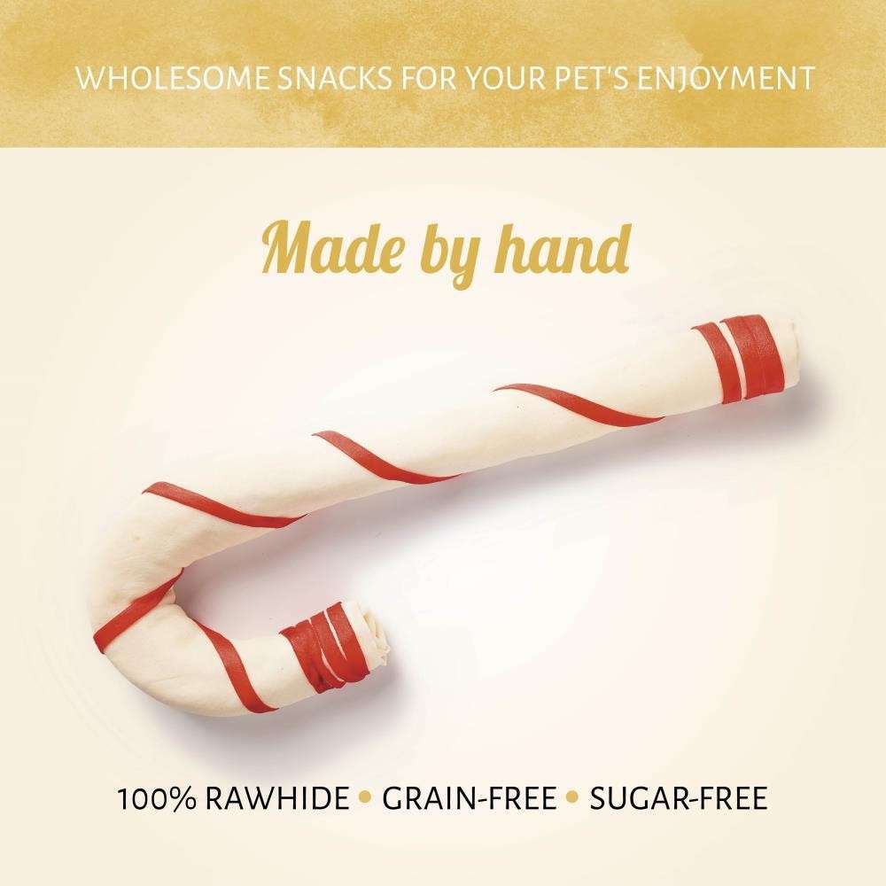 Hecho a mano, nuestro bastón de caramelo navideño de larga duración es un favorito de estas fiestas. Seguro y natural, este masticable de cuero crudo tiene rayas brillantes para hacerle sentir a tu perro el espíritu navideño.