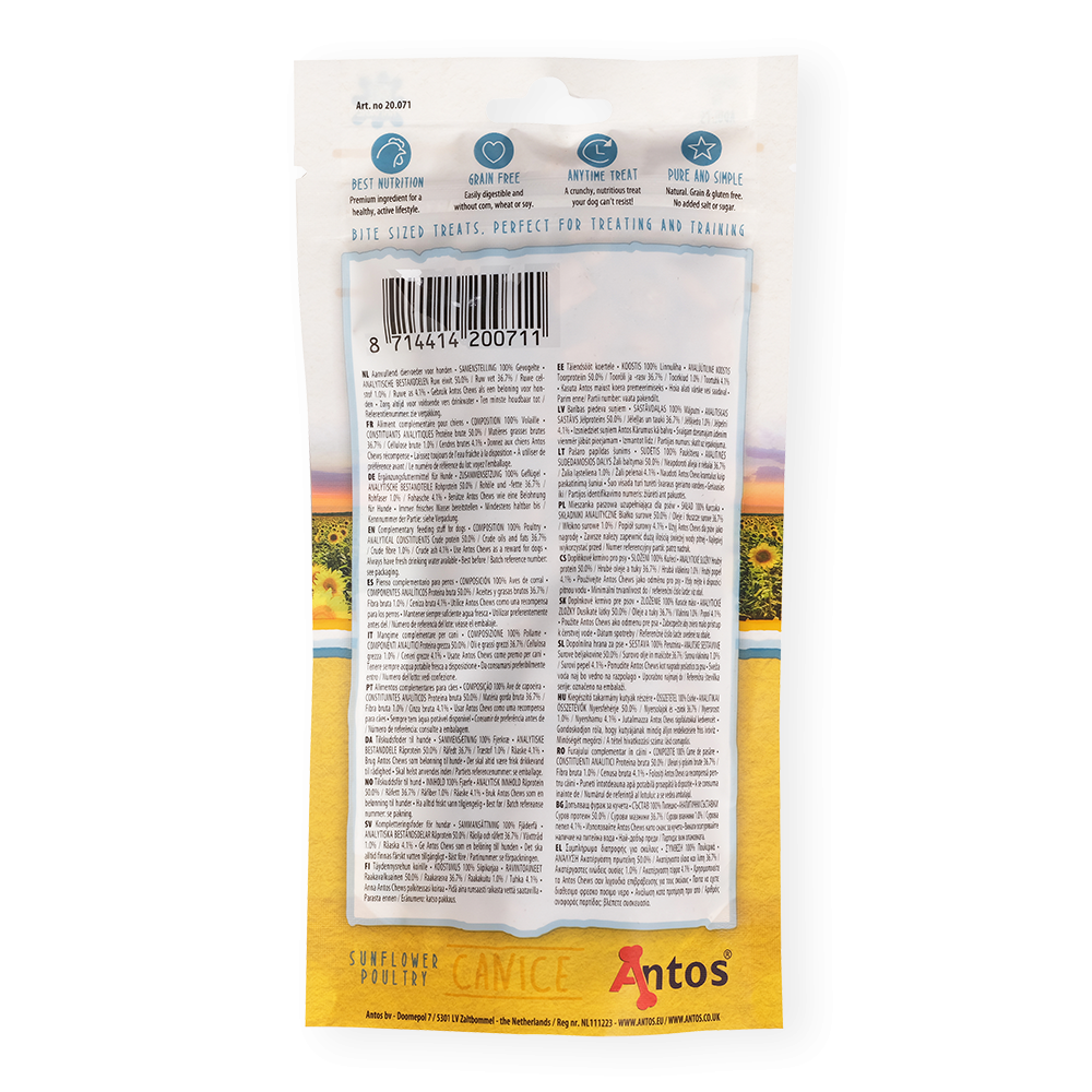 Con un contenido de carne 100 %, nuestros Canice de Ave son aperitivos completamente repletos de proteínas para tu can amante de la carne. Las delicias se han secado con cuidado para que retengan los nutrientes naturales y maximicen su agradable sabor.