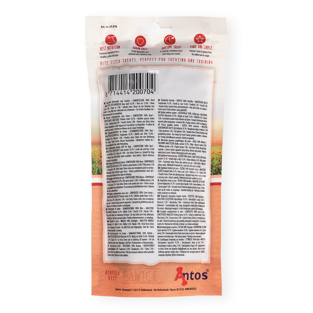 Dale a tu perro el aperitivo que la naturaleza preparó, con el Canice Buey repleto de proteínas. Estos deliciosos bocados se pueden dar como comida, disfrutar como complemento o usar como premio sano durante el entrenamiento. Están hechos de carne de vacuno al 100 % para un sabor que tu perro adorará.
