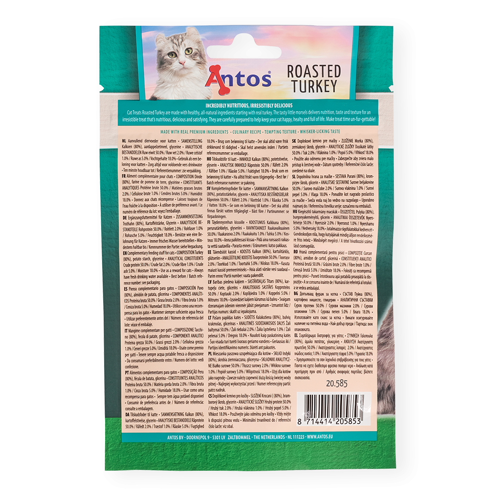 El cuerpo de los gatos está acostumbrado a comer carne de verdad. Mejora la salud y el bienestar general de tu gato con nuestros deliciosos y nutritivos Cat Treats Roasted Pavo. El principal ingrediente de estas golosinas del tamaño de un bocado es pavo rico en proteínas, sin aditivos añadidos.