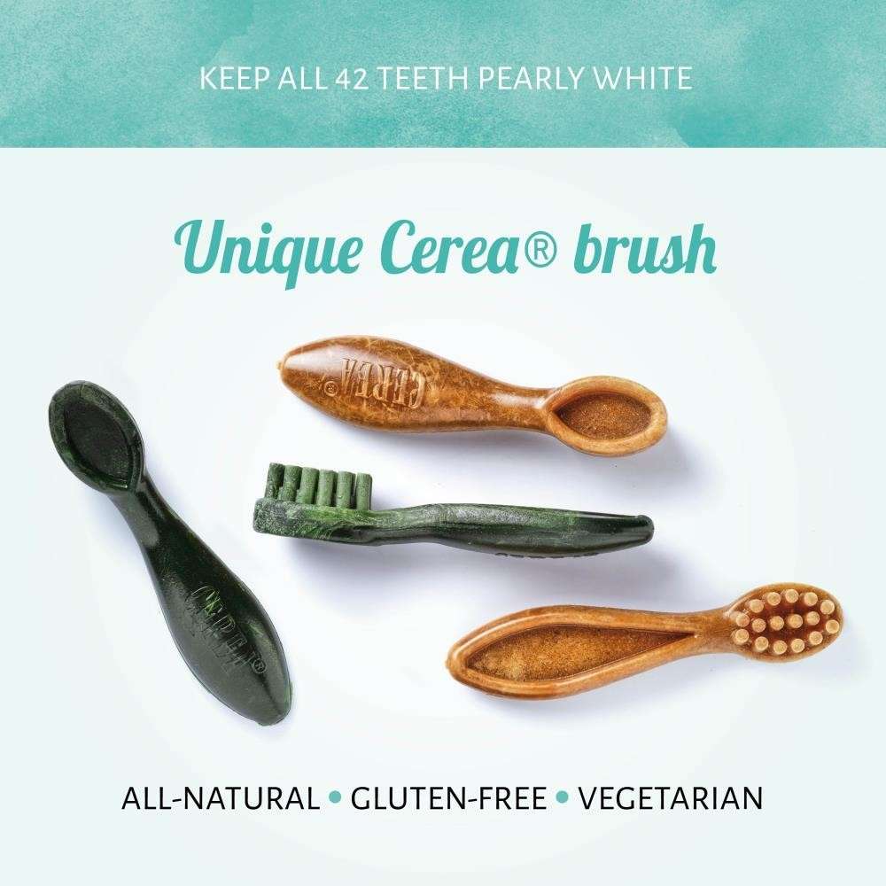 Masticar algo delicioso todos los días puede ayudar a mejorar la salud dental de su perro. Nuestros masticables Cerea Brush tienen una forma de cepillo única y una textura masticable que combate la acumulación de placa y sarro mientras las mascotas disfrutan de su merienda.