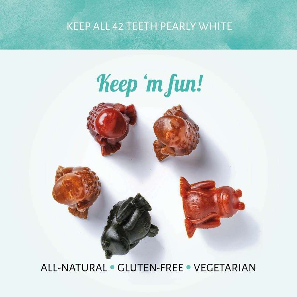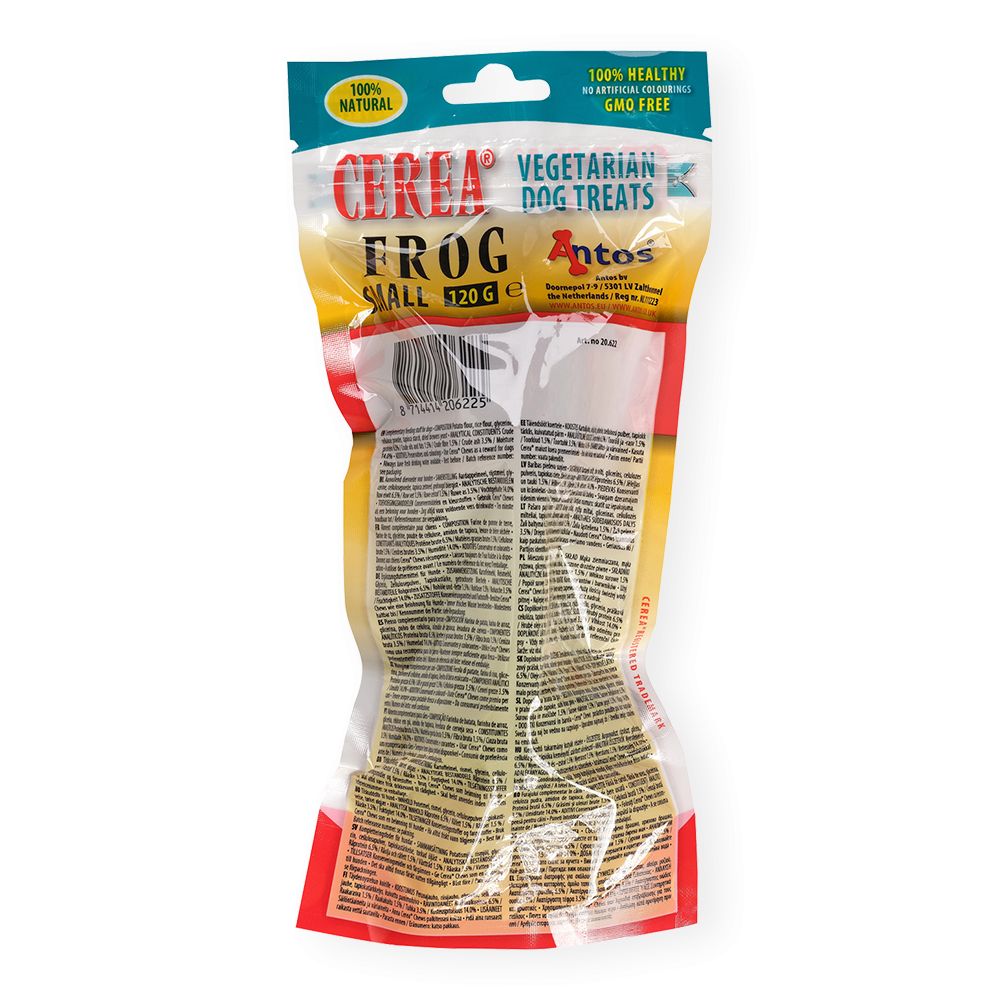 La forma divertida del masticable Cerea Rana ayuda a eliminar el sarro y la placa mientras su perro mastica. Son bajos en grasa, sin gluten, vegetarianos y totalmente naturales. A su mascota le encantarán los ingredientes deliciosos.