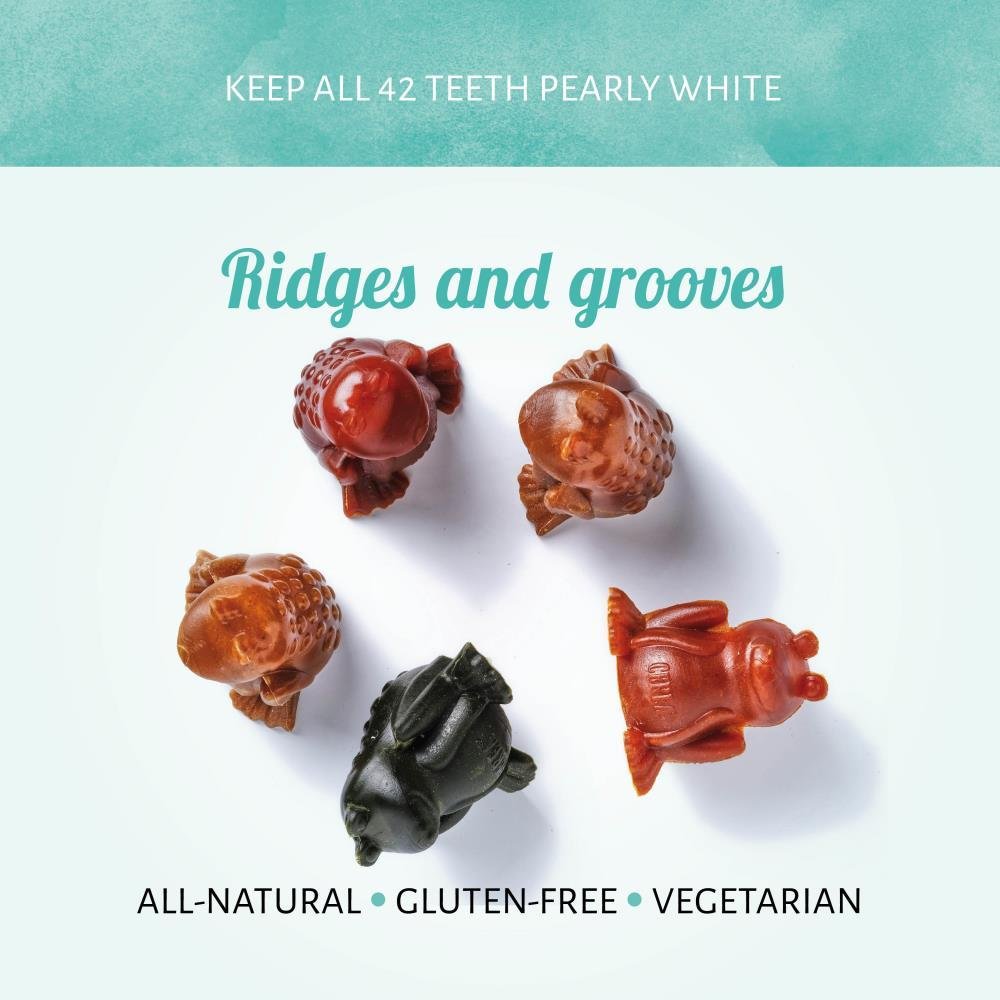 Introduzca un nuevo amor por el cepillado. Nuestro masticable Cerea Rana está hecho con formas y ranuras que pueden ayudar a reducir la placa, el sarro y el mal aliento. ¡Las golosinas sin gluten y vegetarianas mantienen a su perro lejos del dentista!