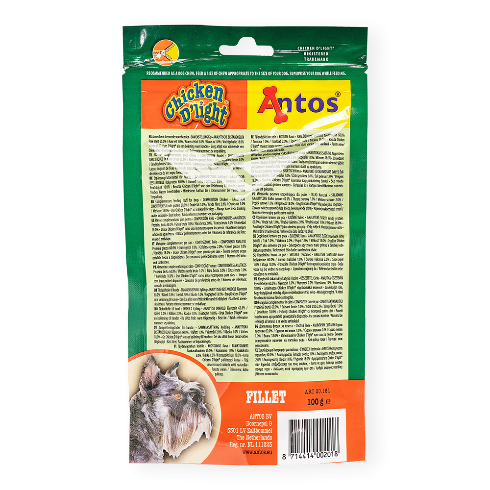 Los perros adoran el pollo. Pues vamos a darles pollo. Dentro de cada bolsa de Chicken D'light Fillet encontrarás verdaderas pechugas de delicioso pollo. Simple delicia sin ningún aditivo.
