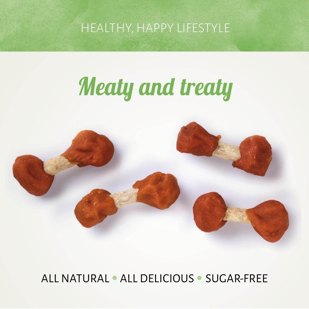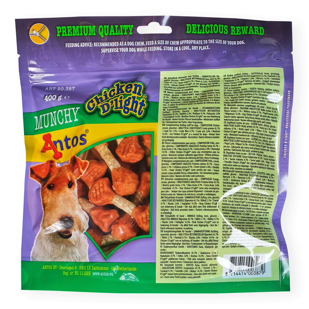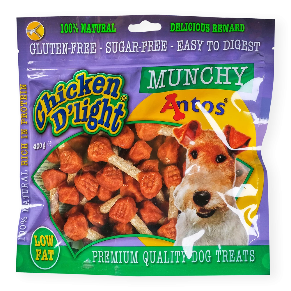 Nuestro Chicken D'light Munchy está hecho con pechuga de pollo y seguro que hace que tu perro menee la cola. Sabroso pollo enrollado alrededor de un centro masticable, creando un manjar con una forma de mancuerna perfecta.