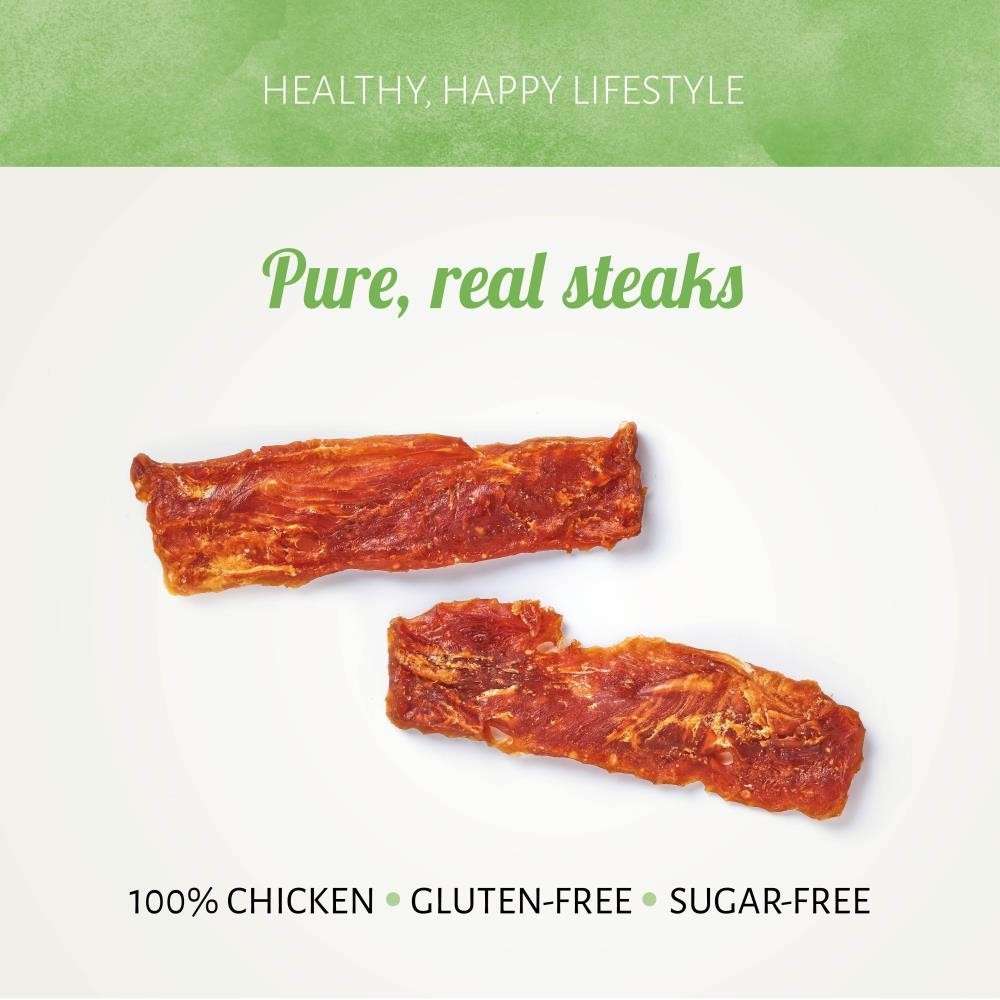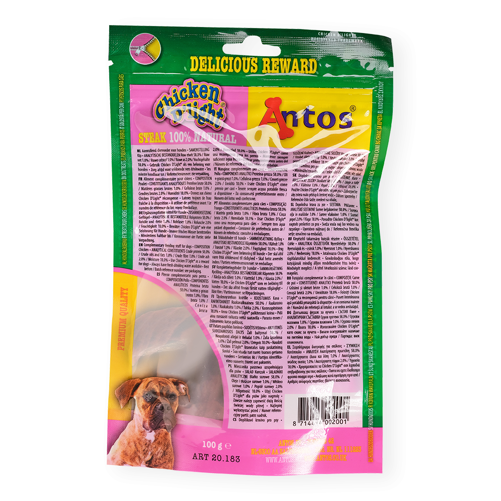 Porque tu peludo amigo se merece lo mejor, recompénsalo con Chicken D'light Steak. Está hecho con pollo 100 % para conseguir un manjar alto en proteínas que les satisfaga y alimente en cada bocado.