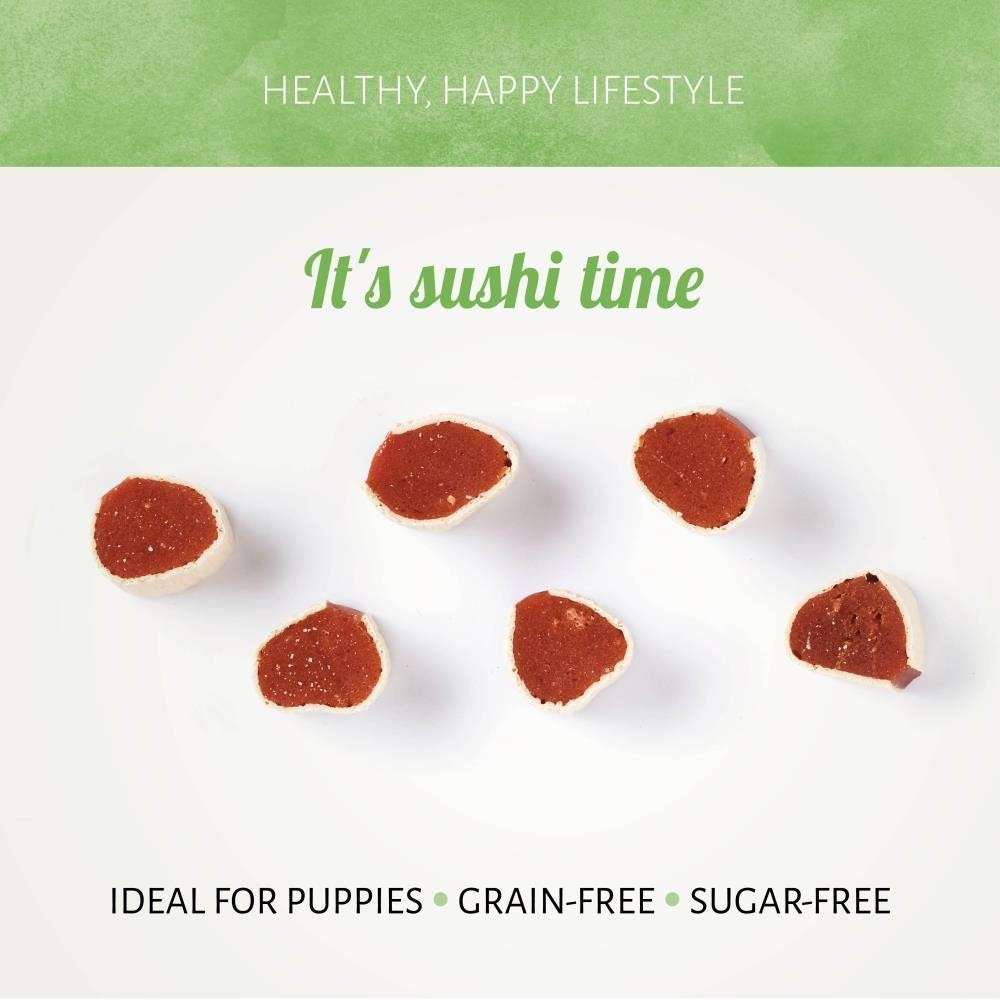 ¡Los perros pueden comer sushi! Nuestro Chicken D'light Sushi es una golosina sabrosa y festiva para perros hecho de puro pollo envuelto en bacalao muy nutritivo. Estos manjares, increíblemente deliciosos, ayudan a promover una piel más sana y un pelaje más brillante.
