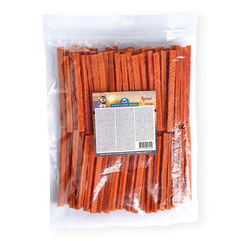 Fish D'light Beams está lleno de un delicioso sabor a pescado. El sabor intenso ahumado hará que tu amigo menee el rabo. Están llenos de ácidos grasos omega-3 para una piel sana y un pelaje brillante, y representan una excelente fuente de proteínas. Estas delicias de salmón auténtico tienen un gran sabor delicioso y son una elección inteligente de golosina para tu amigo de cuatro patas.