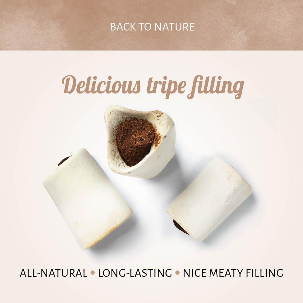 El hueso con tuétano y con tripa blanca es un aperitivo para perros muy atractivo. Estos huesos duraderos proporcionan un bocado duradero para los masticadores agresivos. Los huesos con tuétano llenos de carne están llenos de un relleno de tripa deliciosa en el centro.
