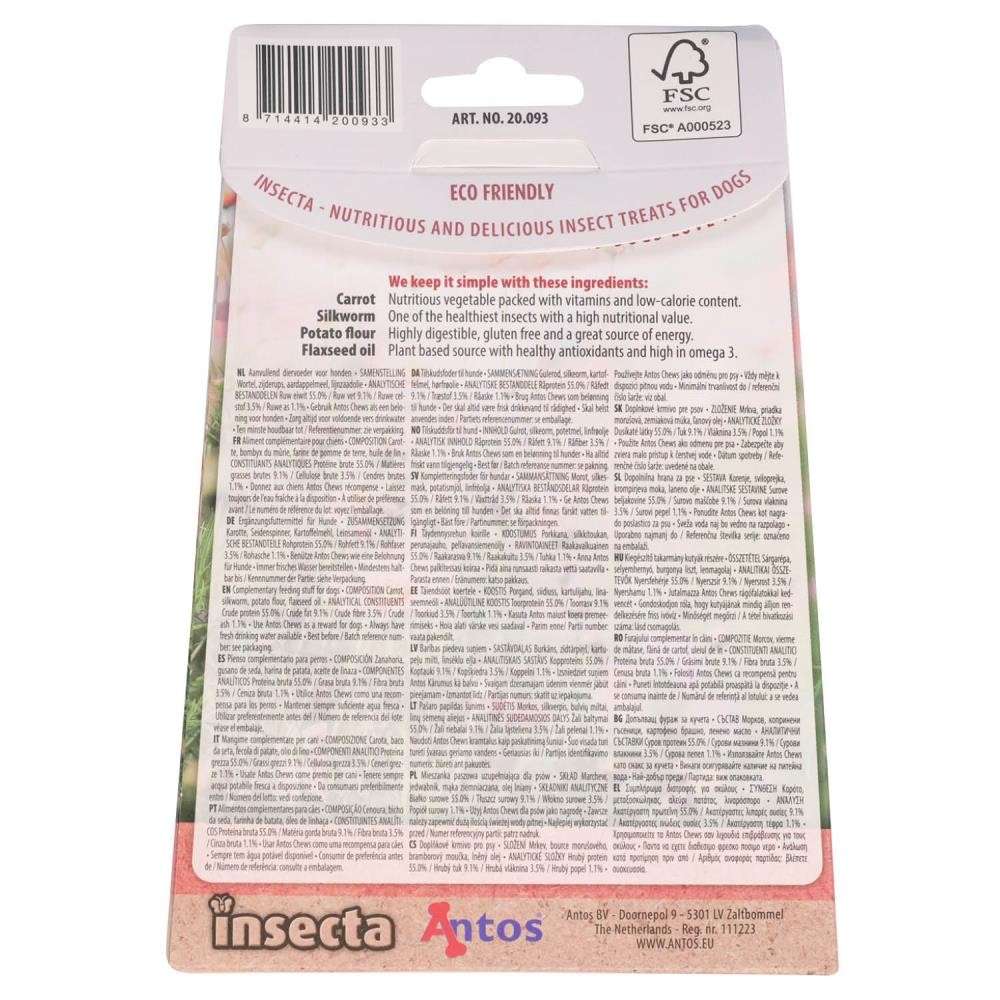 Insecta Nibbles Gusano de Seda & Zanahoria incorporan todo lo bueno de los insectos en una deliciosa y nutritiva delicia para perros. Estos aperitivos saludables tienen el tamaño perfecto para un premio, formulado para complementar la dieta equilibrada de tu perro.