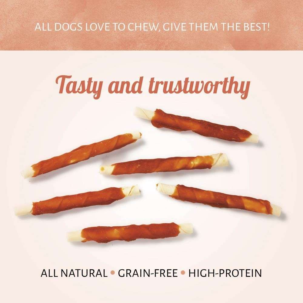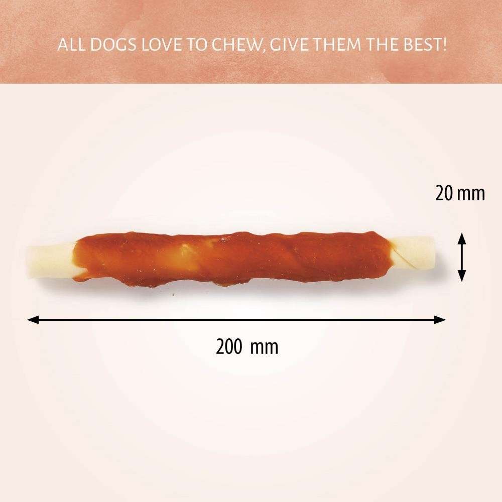 Nuestros clásicos masticables para perros Raw Hide White + Chicken Roll están hechos con carne tierna de pechuga de pollo envuelta alrededor de un palito de cuero crudo. Ofrecen una experiencia masticable de primera calidad que tu perro no podrá resistir. Los masticables para perros serán un éxito en tu hogar.