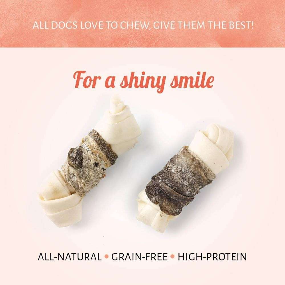 Raw Hide White + Fish Knotted Bone representan la manera más sabrosa de darle una sonrisa brillante a tu perro. Roer este bocado de larga duración mejorará los dientes y encías de tu perro, porque una salud dental perfecta es importante.