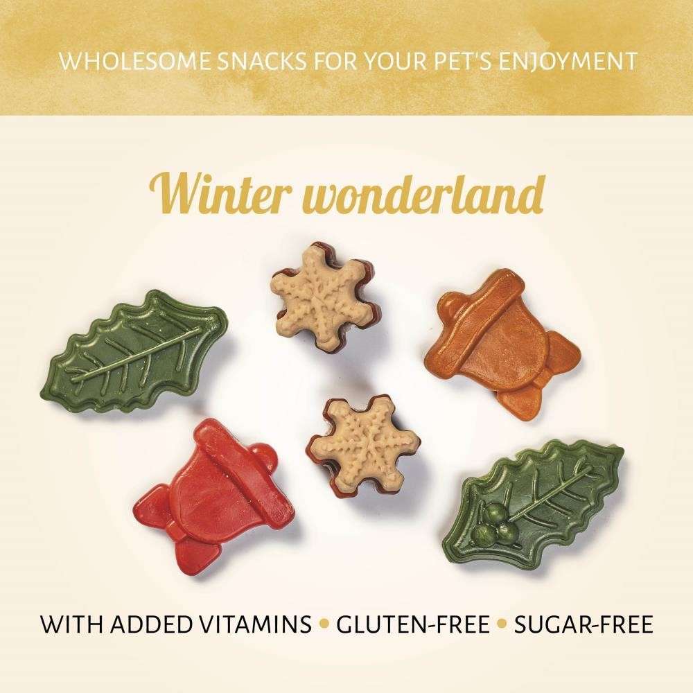 A Winter's Evening - deliciosas golosinas para perros. Sabrosas campanas, encantadoras hojas y dulces copos de nieve que crean un paraíso invernal para tu amigo de cuatro patas. En estas fiestas, elige estas golosinas tan únicas como tu perro.